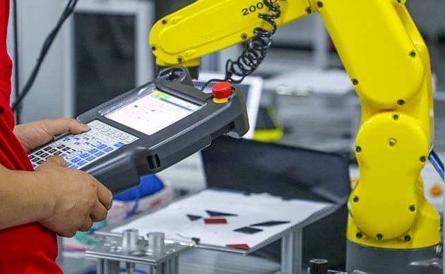 A handy operation panel used in a factory to set (teach) the operation to an equipment robot. The user carries it by hand while using it. Workers in the factory could operate it with their hands covered with oil or other substances.
