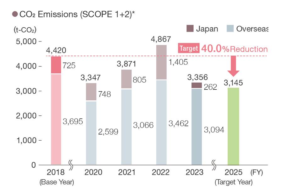 Aiming to achieve carbon neutrality by 2050, the Group had set a target of a 26.6% reduction in CO² emissions by FY2025 (compared to FY2018 levels). Subsequently, reflecting the introduction of renewable energy-derived CO²-free electricity at the Shirakawa and Iwaki factories and a revision of our air conditioning operations as well as other factors, we changed our Scope 1 and 2 reduction target for FY2025 from 26.6% to 40.0% (compared to FY2018 levels). The reduction targets for FY2023 were 55% and 15% reductions compared to the base year for Scope 1 and 2 emissions, respectively. Our actual results for FY2023 were a 57% reduction for Scope 1 and a 36% reduction for Scope 2. The factors behind the Scope 2 emissions reduction included a change from wet etching to laser etching for some processes, a revision of air conditioning operations at our factories, and the introduction of CO²-free electricity derived from renewable energy sources. We will continue to strengthen energy conservation measures to promote CO² reductions.