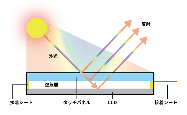 一般的なエアボンディングと呼ばれる貼り合わせ方法では、タッチパネルと液晶の間に空気層ができるため、空気層の界面で外光が反射し、画面がみえにくくなることがあります。 -