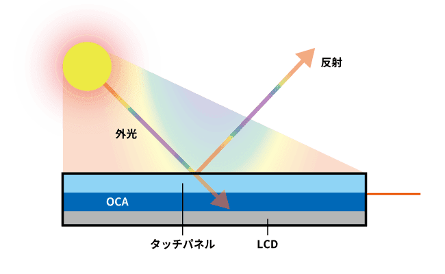 OCA(光学透明接着材)でタッチパネルと液晶間を埋めて空気層をなくすことで、光の反射を最小限に抑えることができます。外光が強い屋外でも画面が見やすくなります。