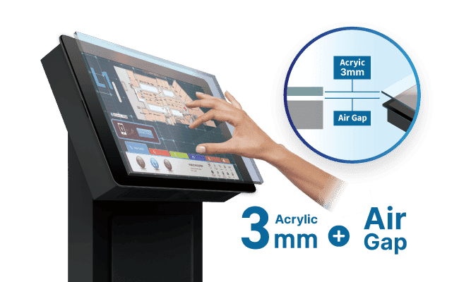 紫外線吸収構造のタッチパネルで、保護フィルムの必要なくメンテナンス工数を削減します。
