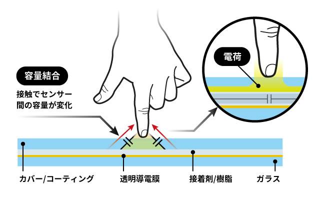 静電容量方式タッチパネルは、指などの導電性物質とディスプレイ間で起きる微弱な静電気の変化量(静電容量)を検出することで位置を特定して動作する方式で、現在世界中で最も広くさまざまなデバイスで採用されているタッチパネル方式です。