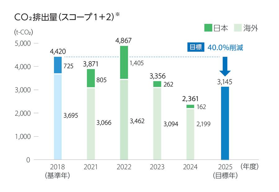 当社グループは、2050年カーボンニュートラルの達成に向け、2025年度のスコープ1・2削減目標を40.0%(2018年度基準)と設定し、グループ全体で取り組みを進めています。また、現在、さらに取り組みを加速すべく、2030年度のスコープ1・2・3の削減目標を策定しています。