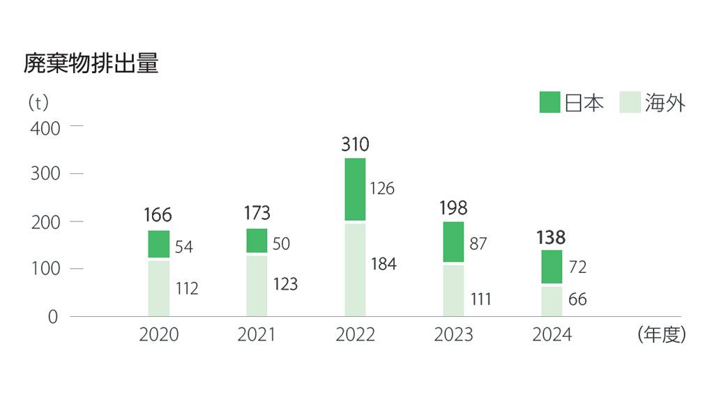 国内の各工場や事業所から排出される産業廃棄物については、産業廃棄物管理票(マニフェスト)を発行し管理しています。これにより、産業廃棄物処理委託業者の管理、マニフェスト交付・回収状況の管理などを専用のデータベースで一元管理し、廃棄物排出の状況を確実に把握できるようにしています。生産工程でのロス率低減は廃棄物の削減に直結することから、最適品質を維持するしくみの構築で製造不良の改善に注力しています。